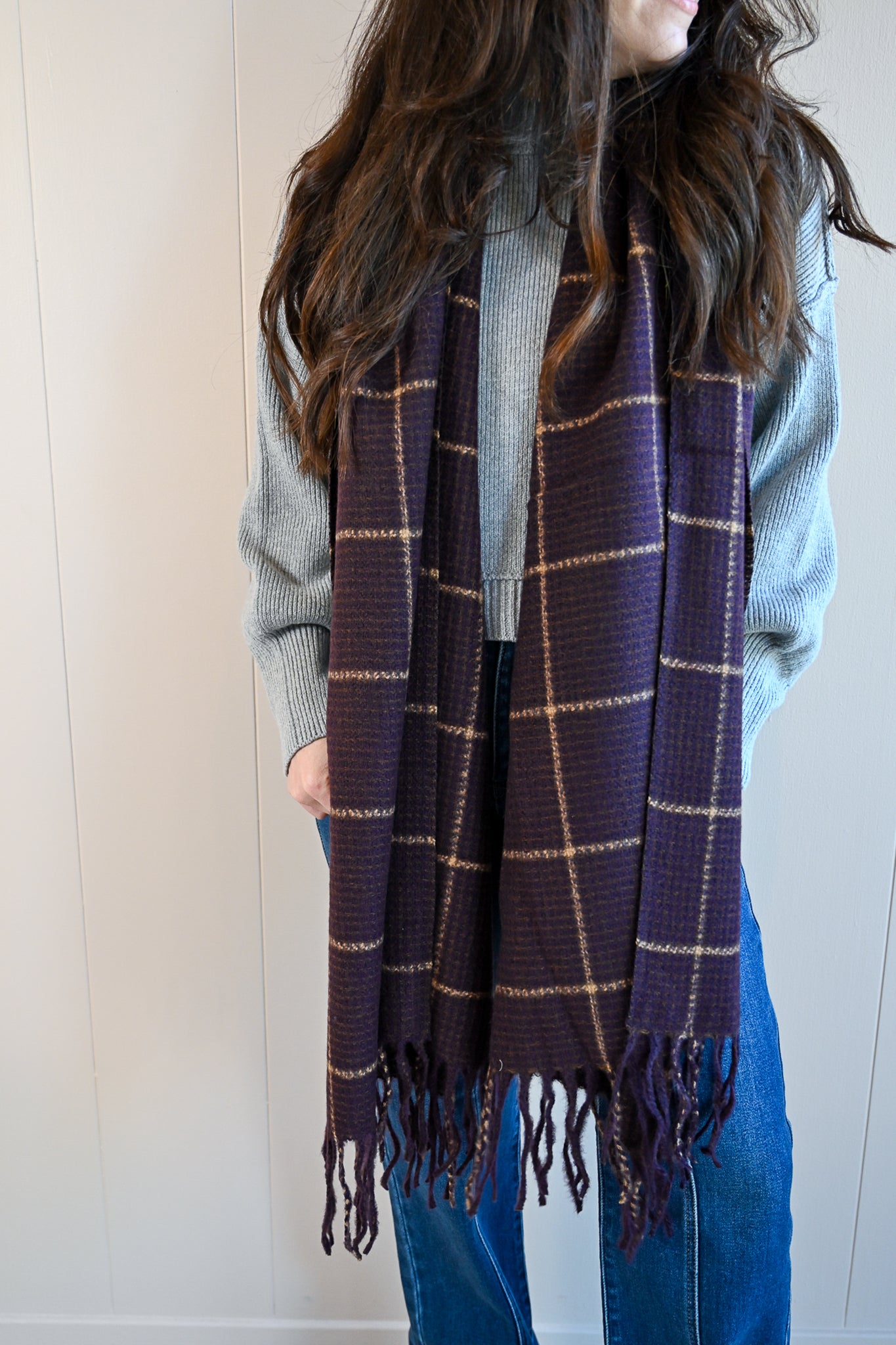 A fall-winter essential with a modern plaid twist. This oversized scarf is designed in deep berry palette with long fringe edges for a touch of texture. Soft, cozy, and easy to style—wrap it, drape it, or wear it loose for an instant upgrade to any cold-weather outfit.