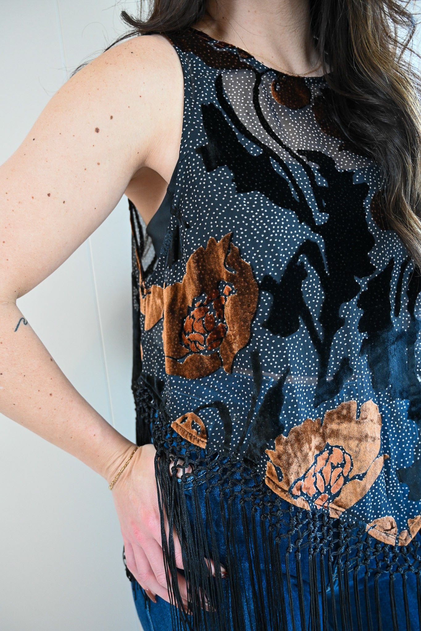 Gals, if there was ever a top that truly embodied me & my style, here you go! The stunner high neck tank lives up to its name. Finished in a rich black and rust floral velvet, it features a sleek high neckline, back button keyhole, and dramatic fringe hem that moves beautifully with every step. Unlined for a light, easy drape—perfect for nights out or layering under a jacket when the temps drop. This style runs true to size.