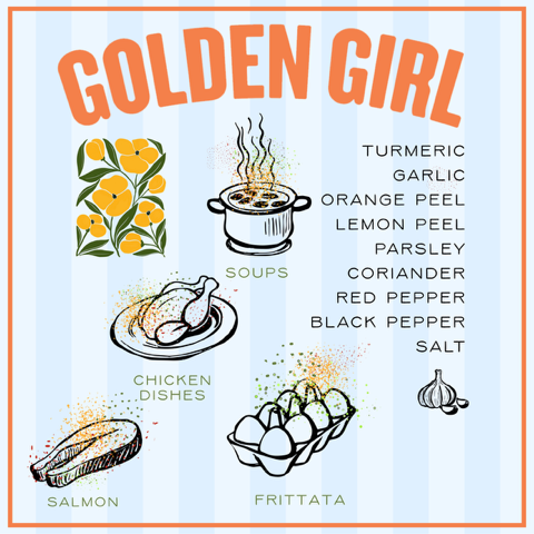 She’s zesty, bold, and ready to shake up your kitchen. Packed with tangy turmeric, citrus peel, garlic, and a lively mix of herbs, Golden Girl brings the flavor and flair to whatever she touches. From roasted veggies to grilled chicken, upgrade your hummus, or dash on your pop-corn, she’s the spice blend that turns everyday meals into something worth dancing about.