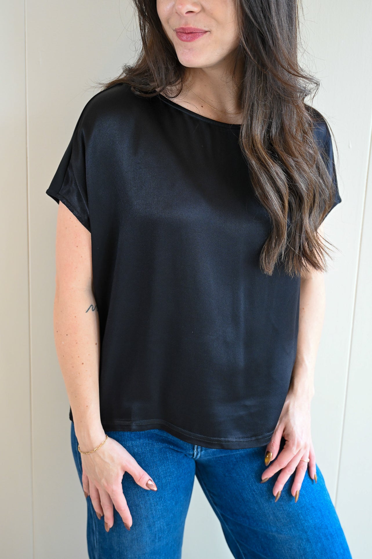Simple with a touch of polish, this slouchy short sleeve top features a relaxed fit and a soft round neckline that flatters every shape. The slightly oversized silhouette gives it that easy, laid-back feel, while the black fabric adds a subtle sheen that catches the light just right. A piece that looks as good dressed up as it does off-duty. This style runs true to size.