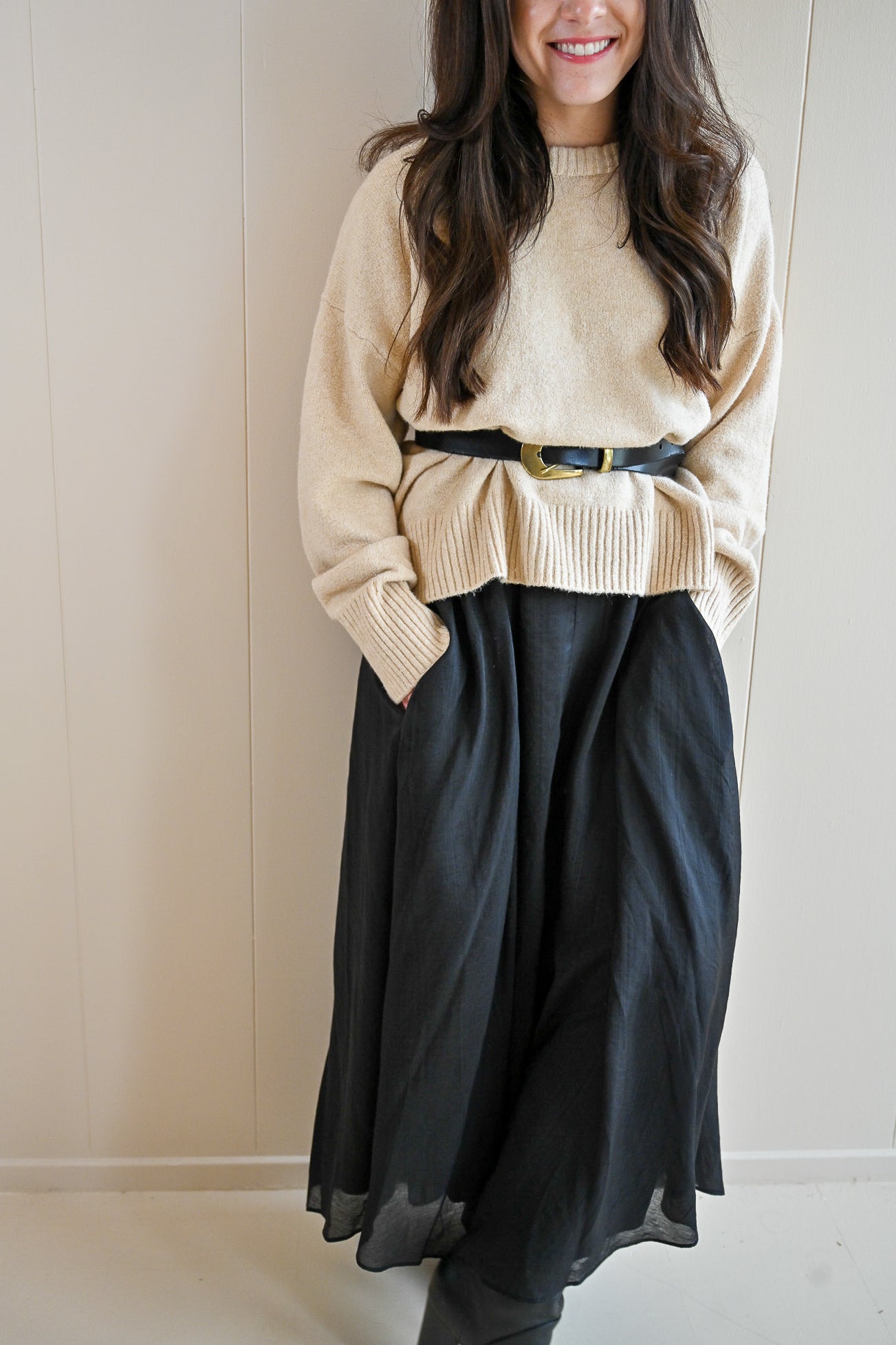 This effortlessly elegant black dress is all about easy movement and eye-catching detail. Made from a lightweight, flowy fabric with a soft crinkled texture, it drapes beautifully for a flattering fit.