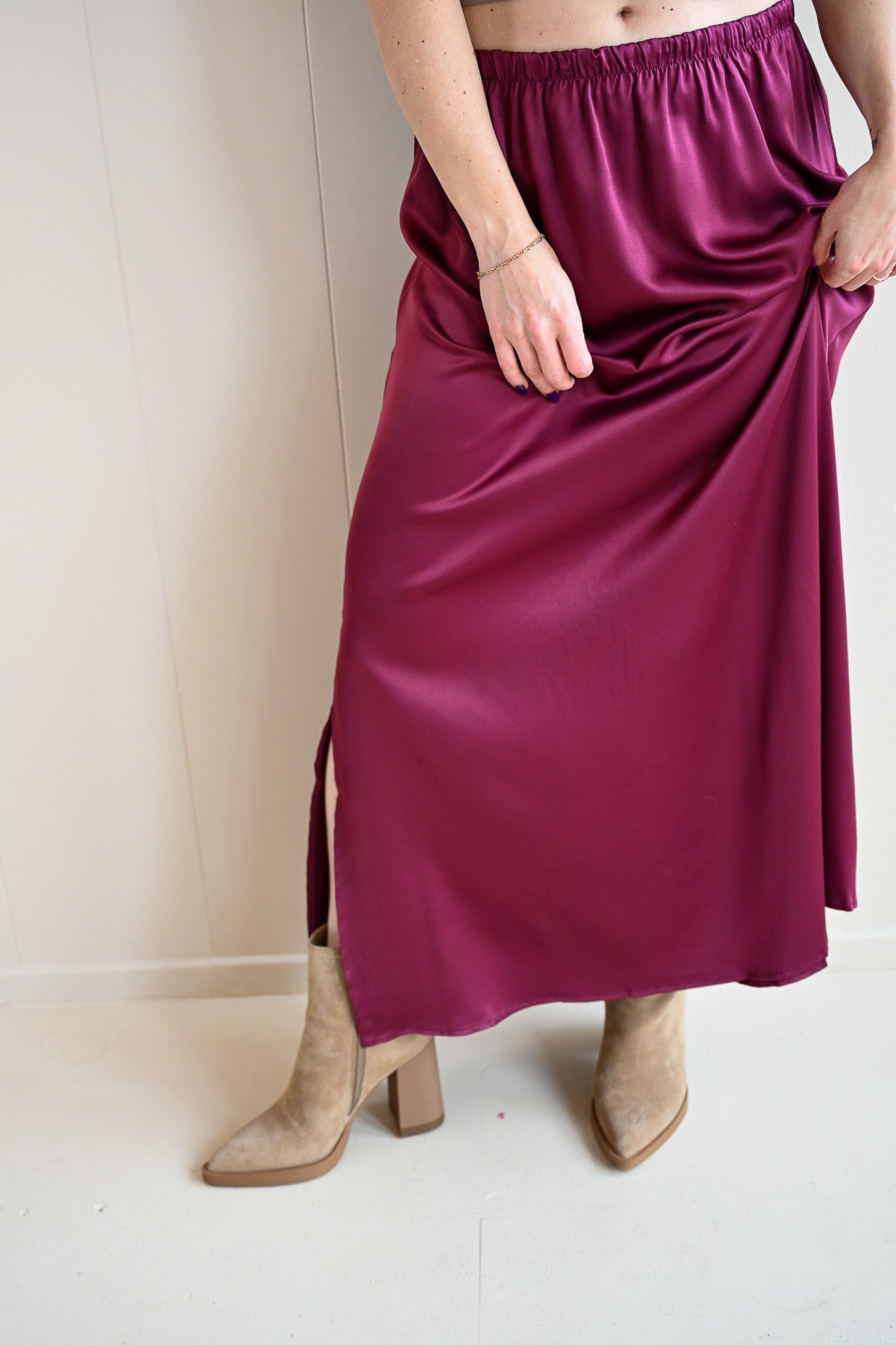 Romantic and refined, this lace maxi skirt is a true standout for the season. Designed in a rich deep wine hue with intricate lace detailing, side slit and a removable lining, it offers the perfect balance of elegance and versatility. Dress it up for an evening out or style it casually with a cozy knit—it’s beautiful either way. This style runs true to size.