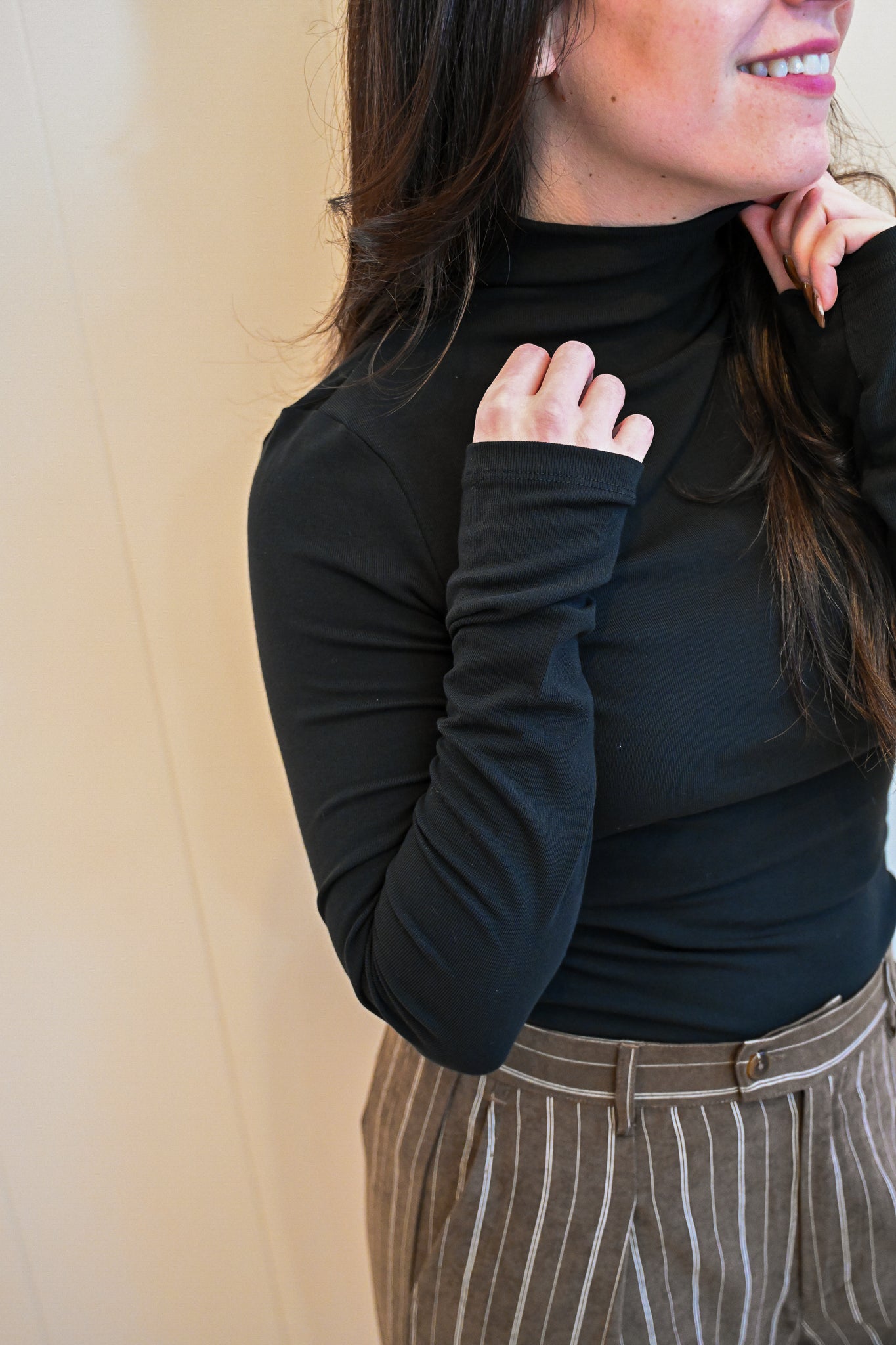 Soft, sleek, and perfectly fitted. This turtleneck is made from 'skims like' second skin rib fabric that moves with you for all-day comfort. Finished with a smooth wash and classic shape, it’s ideal for tucking into denim or layering under blazers and jackets all season long. This style is very fitted, go up in size for more room.