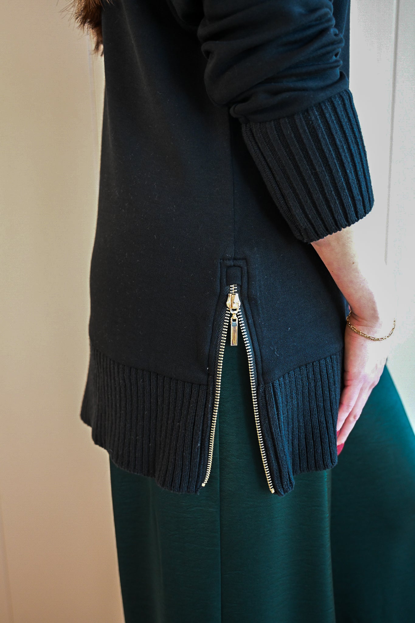 A modern layer with a touch of edge - it feels like a luxe sweatshirt. This midweight knit mock neck features a relaxed fit with ribbed trim for subtle texture and side zips that let you adjust your look—wear it loose for an easy drape or zipped for a more structured feel. Soft, sleek, and perfect for cool days over denim or leggings. Style runs true to size with a long boxy cut.