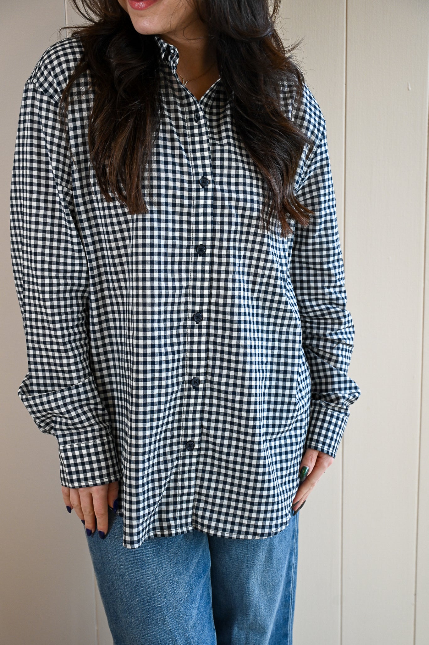 A classic with everyday appeal. This navy and white gingham button-up is made from lightweight 100% cotton poplin for a crisp, breathable feel. Designed with a regular fit, long sleeves, and a timeless collared neckline, it’s effortlessly polished worn on its own or layered open over a tee. The kind of go-to top you’ll reach for day after day, style runs true to size.
